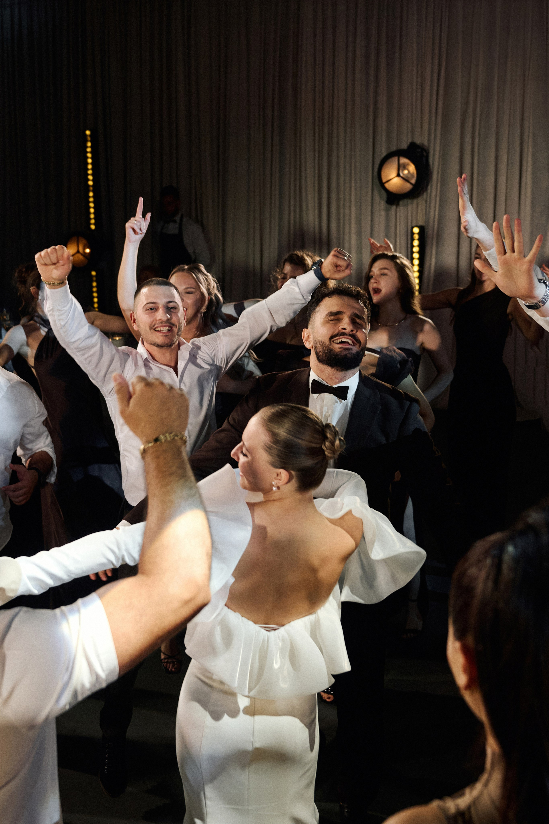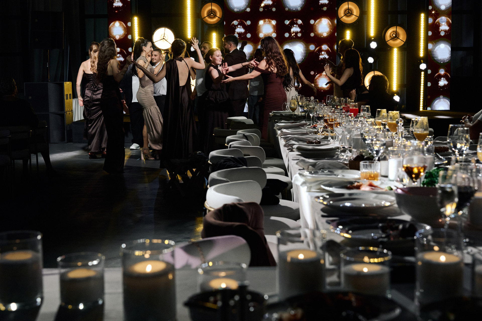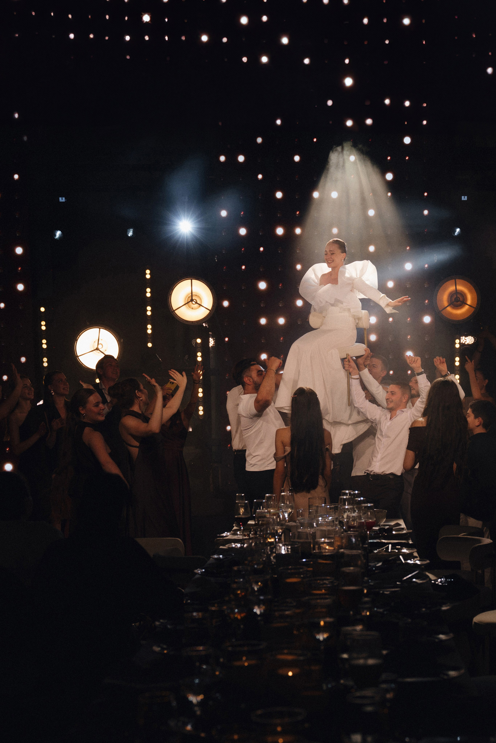 Каждая деталь в декоре на свадьбе ребят была продумана до мелочей, чтобы создать цельную и атмосферную картину. Стены веранды были были изящно задрапированы светлым бархатом, гостевые столы выстоены в форму буквы "Ш" и украшены двумя сотнями мерцающих свечей, наполняющий вечер мягким светом и теплом. Всего для оформления было использовано около 500 метров ткани.